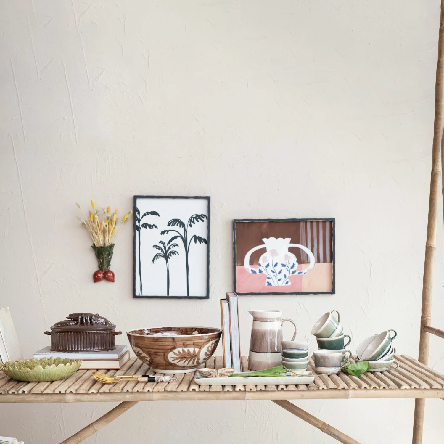 This expertly crafted 12 oz stoneware mug features distinctive stripe patterns and a reactive crackle glaze that ensures each piece is uniquely different. Available in four color variations, the 4" round by 3" high design offers comfortable handling and generous capacity. Dishwasher and microwave safe, this durable mug combines artisanal aesthetics with practical functionality, making it both a daily essential and thoughtful gift option.