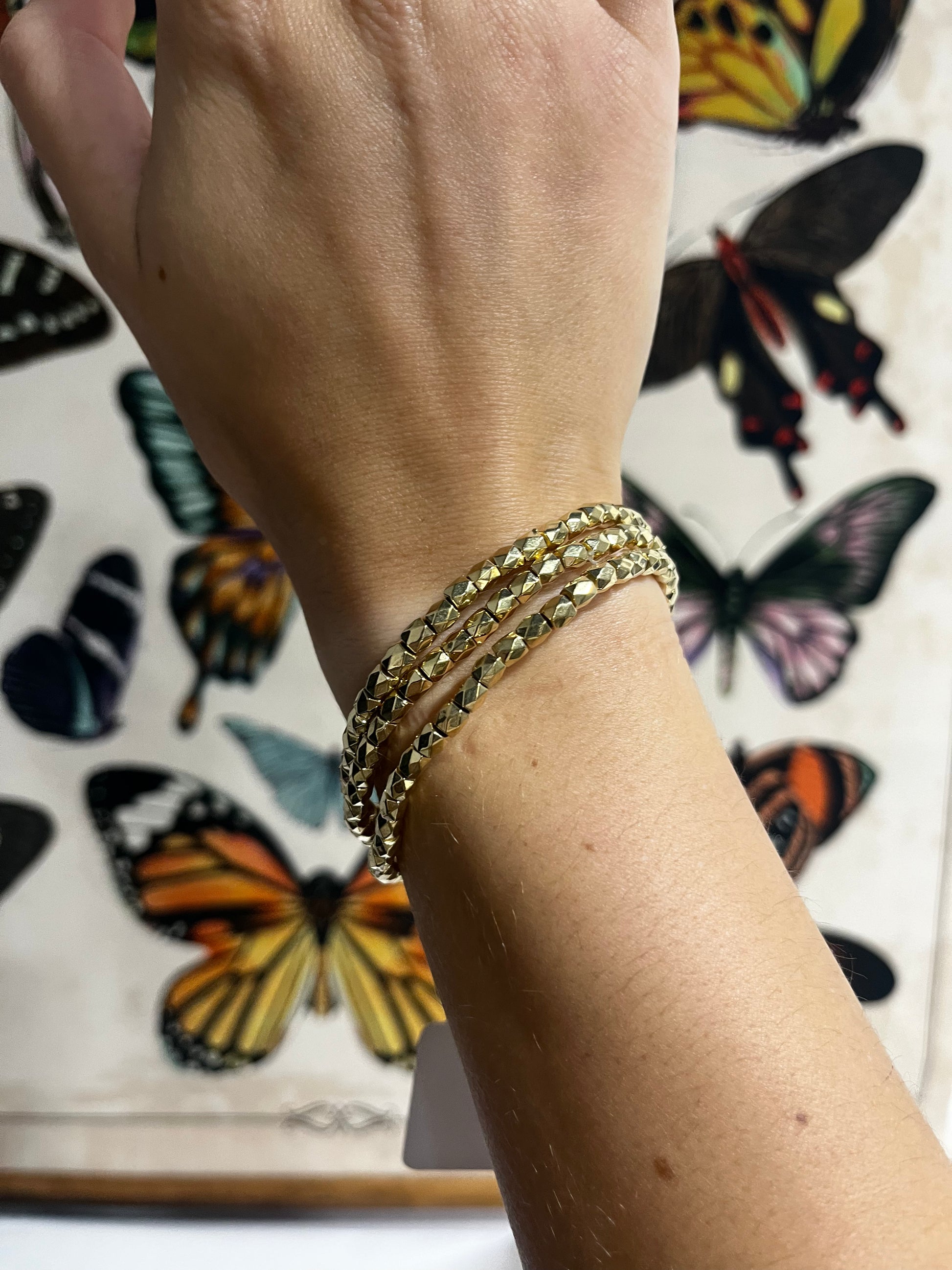 Elevate your accessory collection with this 3-piece gold bracelet stack. Each elastic bracelet offers a comfortable fit and versatile style, perfect for layering or wearing individually. The warm gold tones add a refined touch to any outfit, making this set an essential addition for those who appreciate subtle elegance and effortless sophistication.