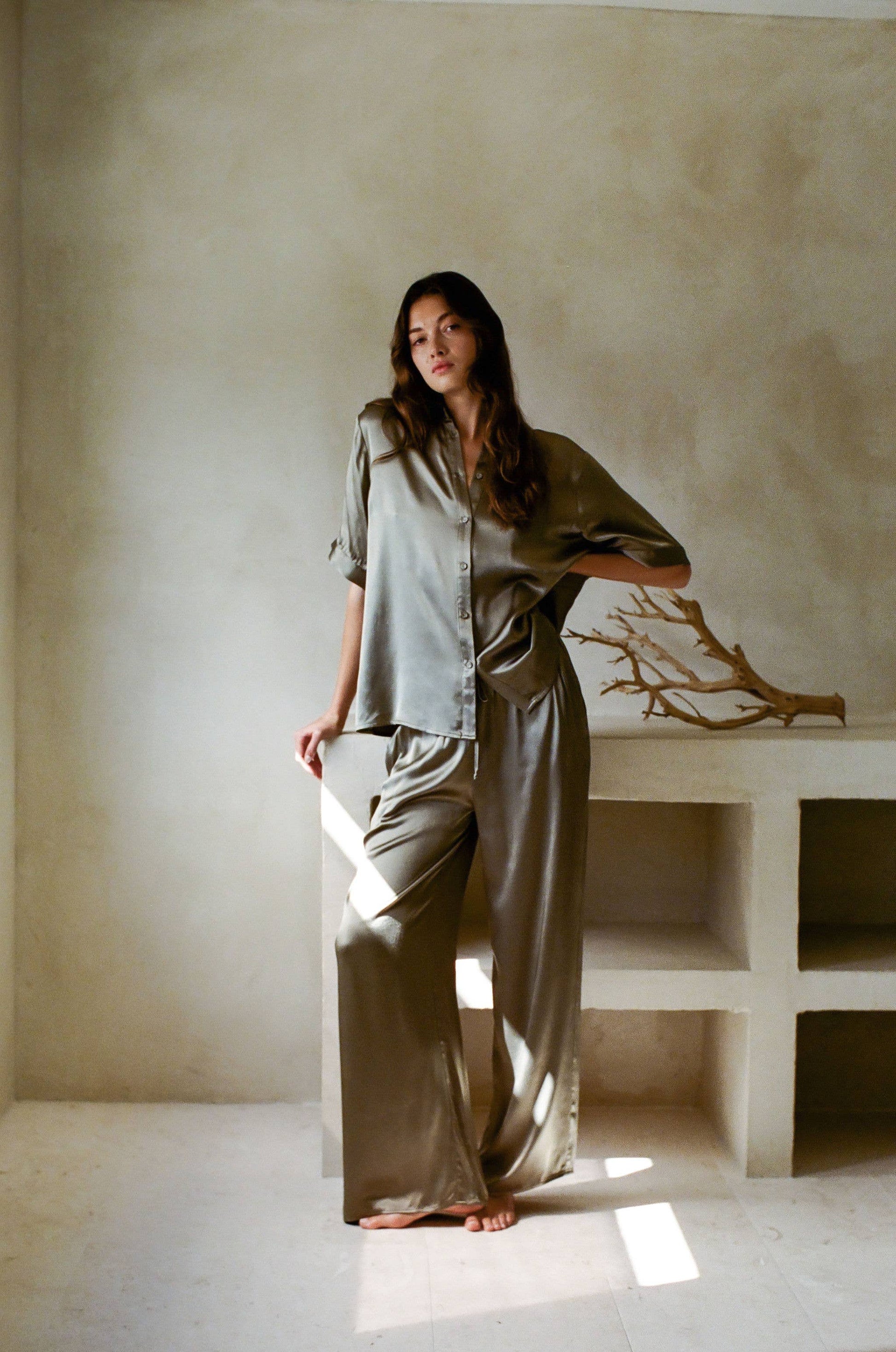 These woven satin wide-leg pants feature a drawstring waist strap for a tailored fit and elegant drape. Olive Color