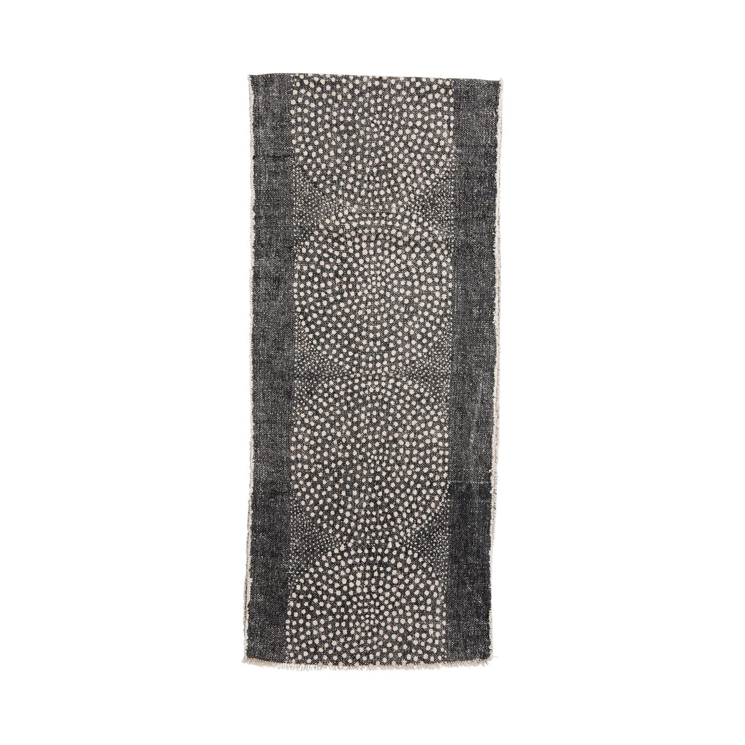 Elevate your dining experience with this expertly crafted cotton table runner featuring a stonewashed cotton canvas in a subtle black dot pattern. Measuring 72" long and 14" wide, its frayed edges add a refined rustic charm while the durable fabric ensures lasting quality. Perfect for adding texture and understated elegance to any table setting.