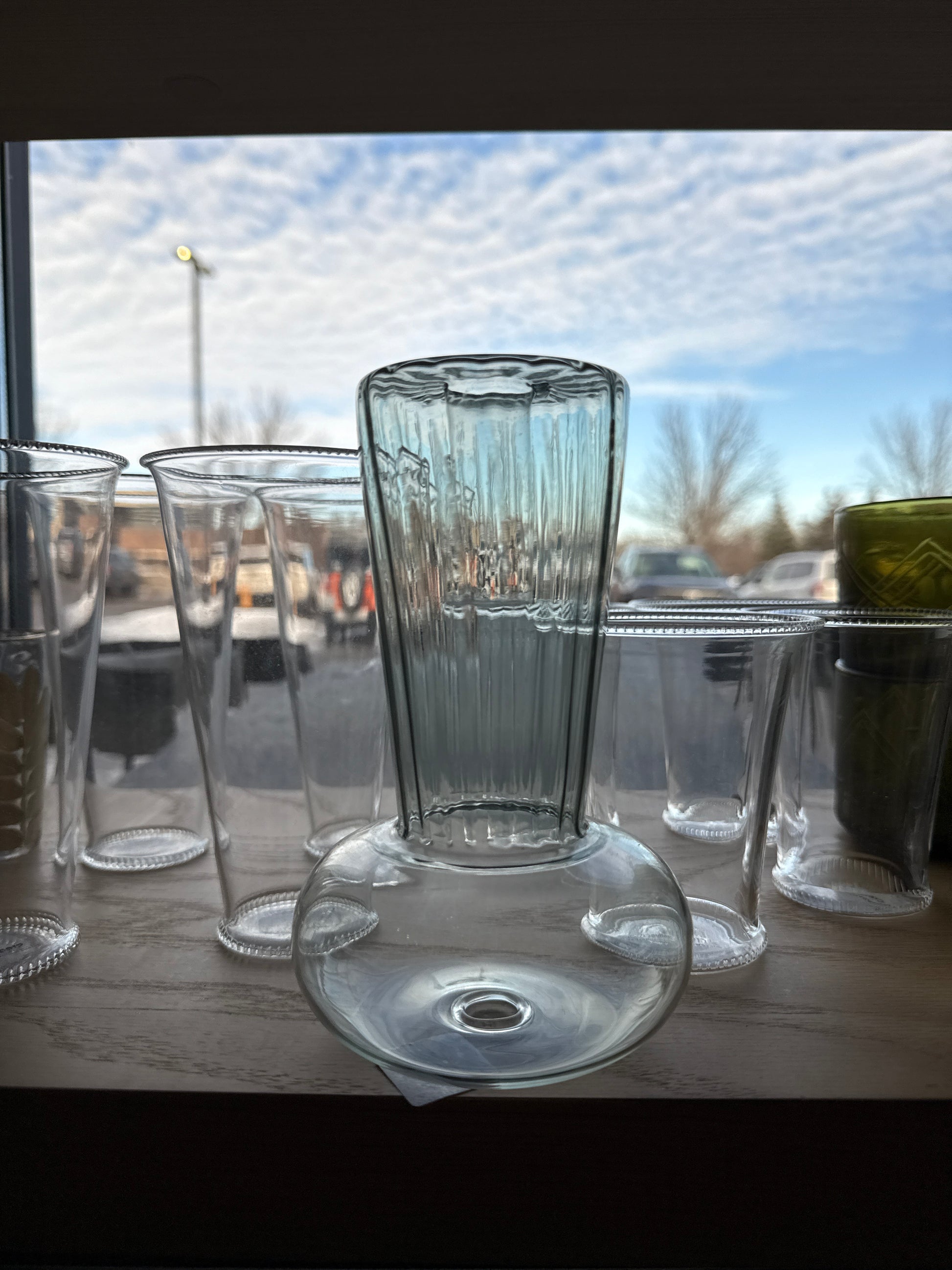 The Josephine Candleholder stands 7 inches tall with a 4-inch round base, featuring a glass design enhanced by a subtle blue hint. Its modern aesthetic complements a variety of décor styles, providing stability and a contemporary elegance to candle arrangements, ideal for enhancing ambient lighting in any setting.