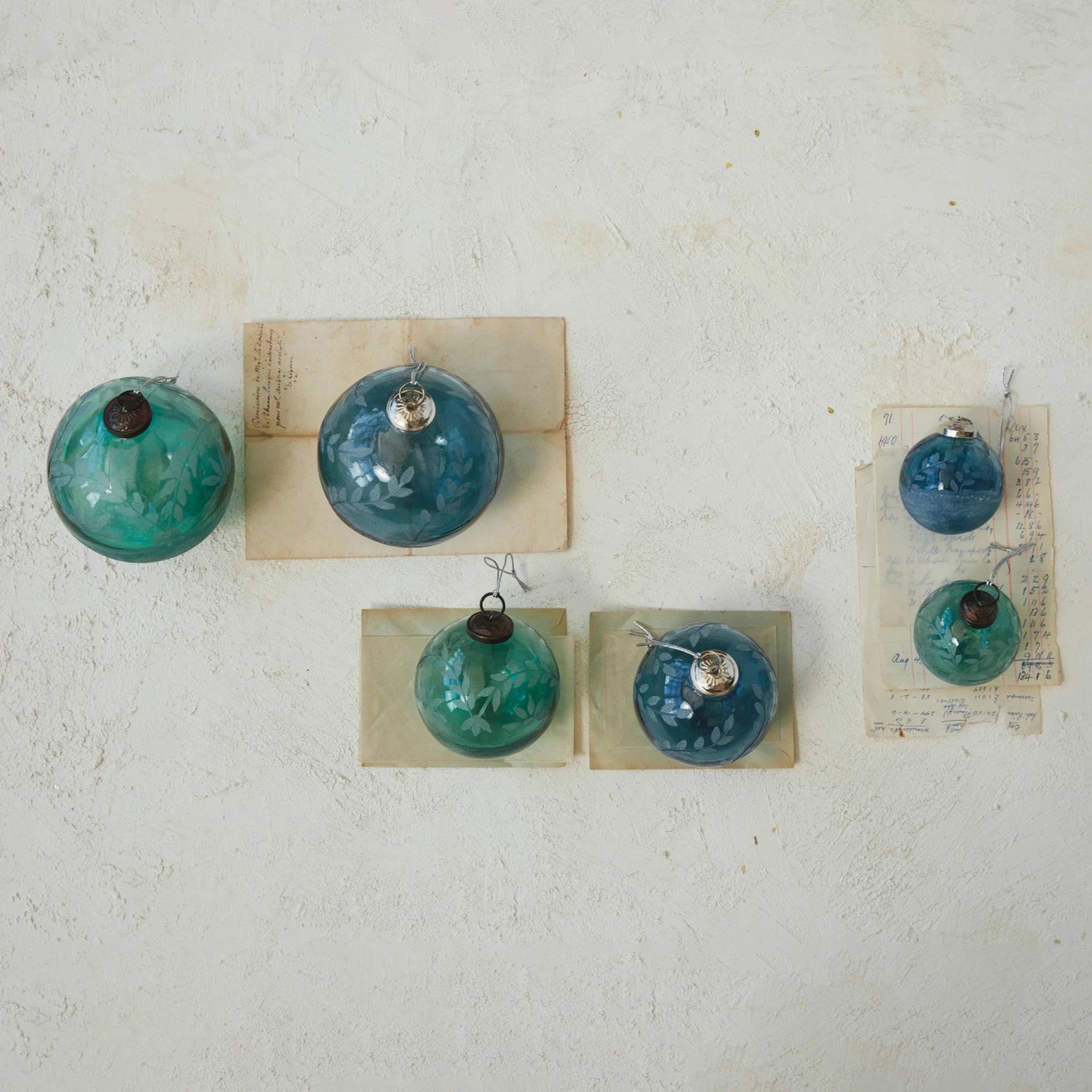 4" Recycled Glass Ball Ornament w/ Etched Leaves