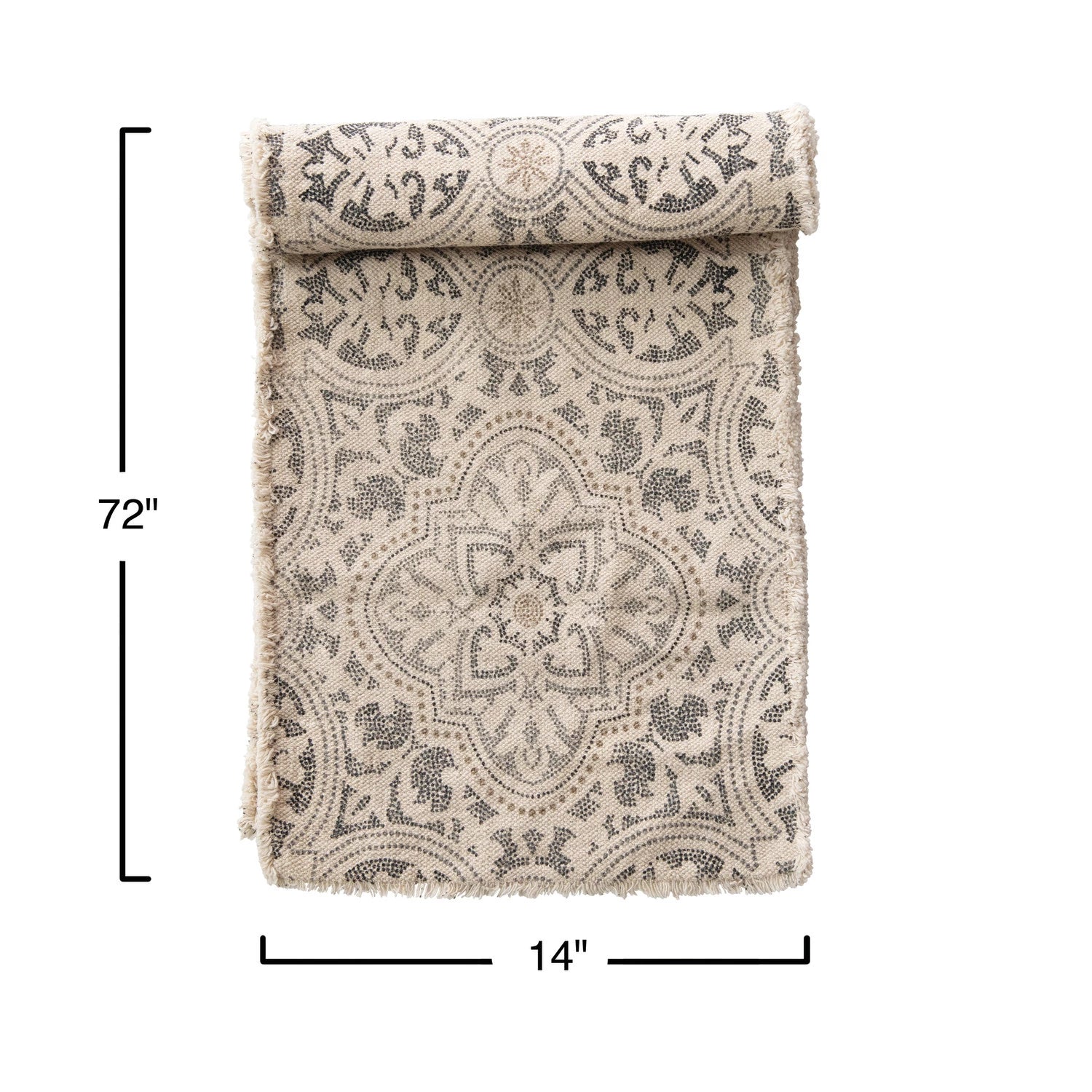 72"L x 14"W Cotton Printed Table Runner w/ Fringe, Grey & Cream Color