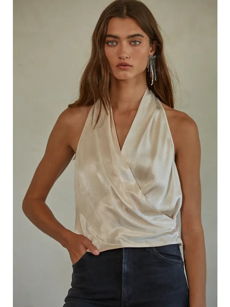 Crafted from a luxurious blend of woven polyester and rayon satin, the Ella Top in White Sand features a sophisticated surplice halter neck design. Its sleeveless silhouette offers a flattering fit, combining elegance with comfort. Ideal for both professional settings and upscale casual occasions, this top delivers a refined look with a smooth, lustrous finish that enhances your wardrobe versatility.