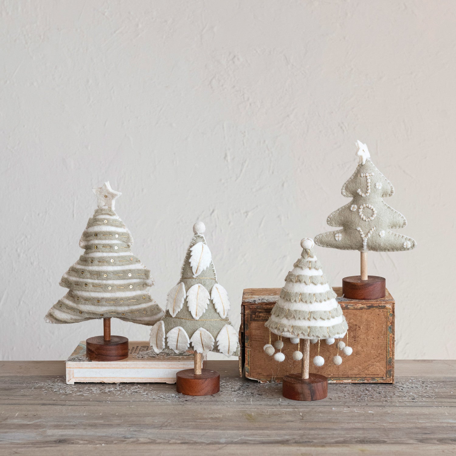 Wool Felt Christmas Tree w/ Applique, Pom Poms/Star & Wood Base, 4 Styles