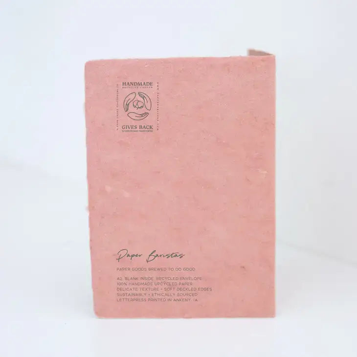 Our handmade deckled edge paper collection is letterpress printed in-house late at night with lots of coffee. This card is meant to be treasured for years to come. Handmade paper beautiful enough to frame and helps us ensure there was no slave labor in our supply chain.